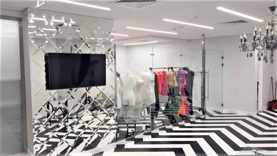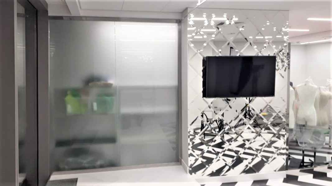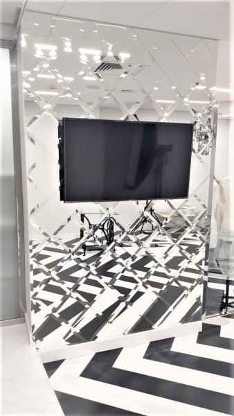 Задача: Изготовить Цельностеклянную перегородку GLASS без примыкания к потолку, изготовить Пано из зеркал с фацетом, Закрыть стену негабаритным цельным зеркалом.