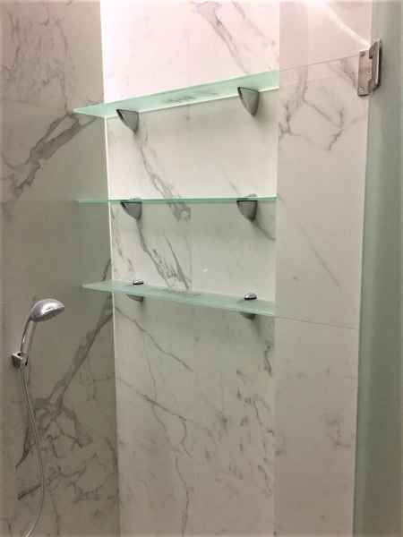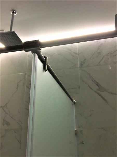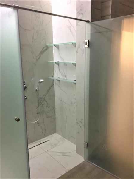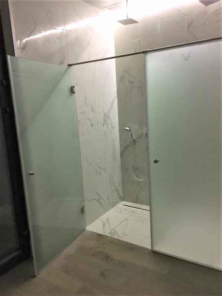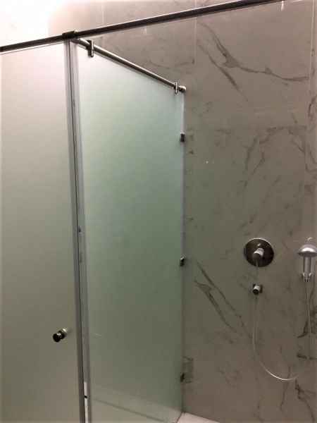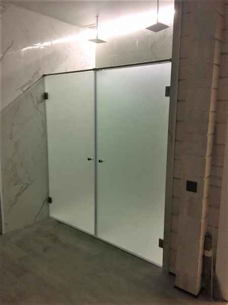 Цельностеклянные перегородки GLASS могут служить душевыми перегородками. На данном объекте было предложены матовые перегородки, изготовленные из безопасного закаленного стекла Matelux, толщиной 8мм. Фурнитура использована для душевых кабин из нержавеющей стали.